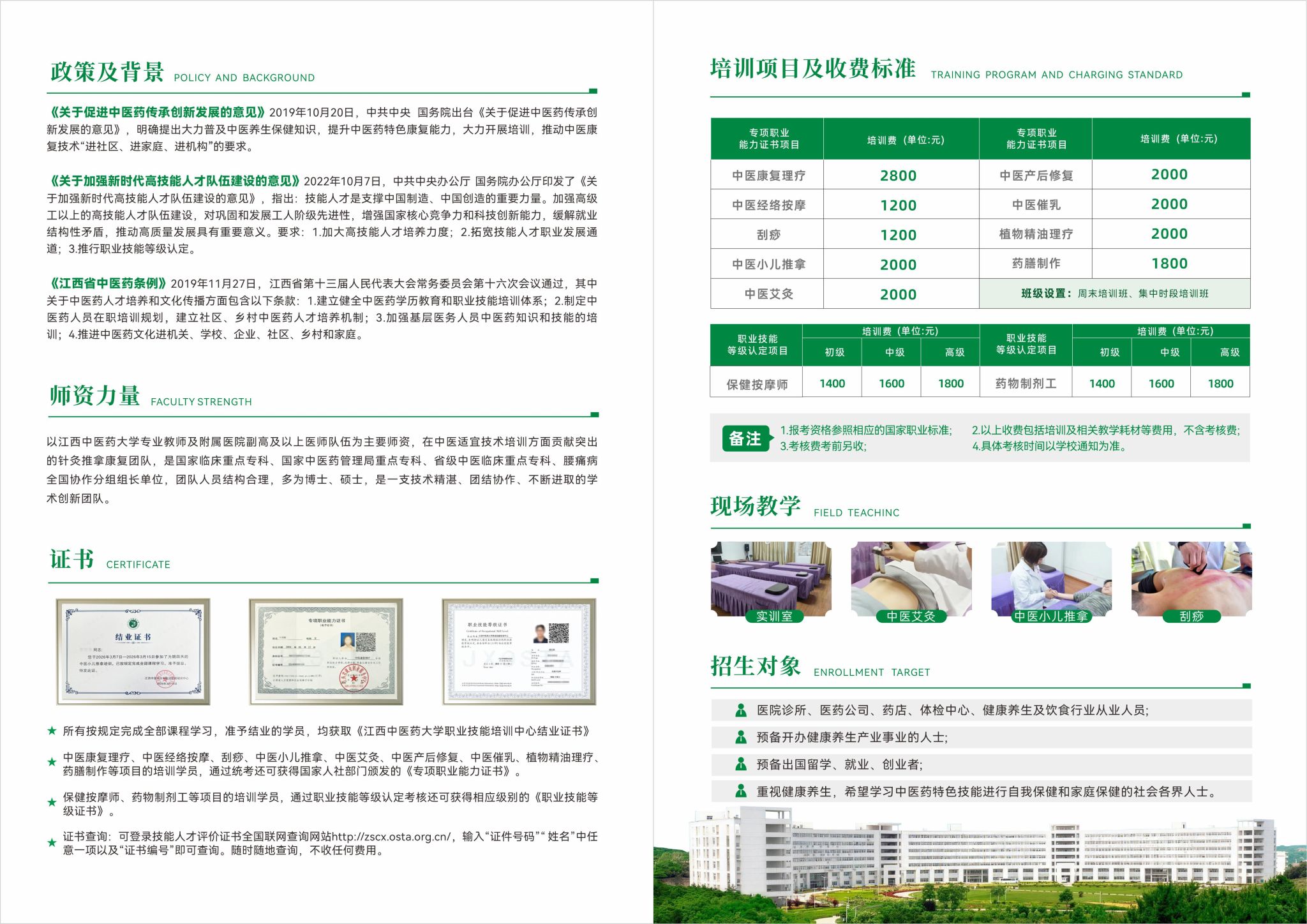1.专项职业能力培训:中医康复理疗、经络按摩、刮痧、小儿推拿、艾灸、产后修复、催乳、植物精油理疗、药膳制作等。