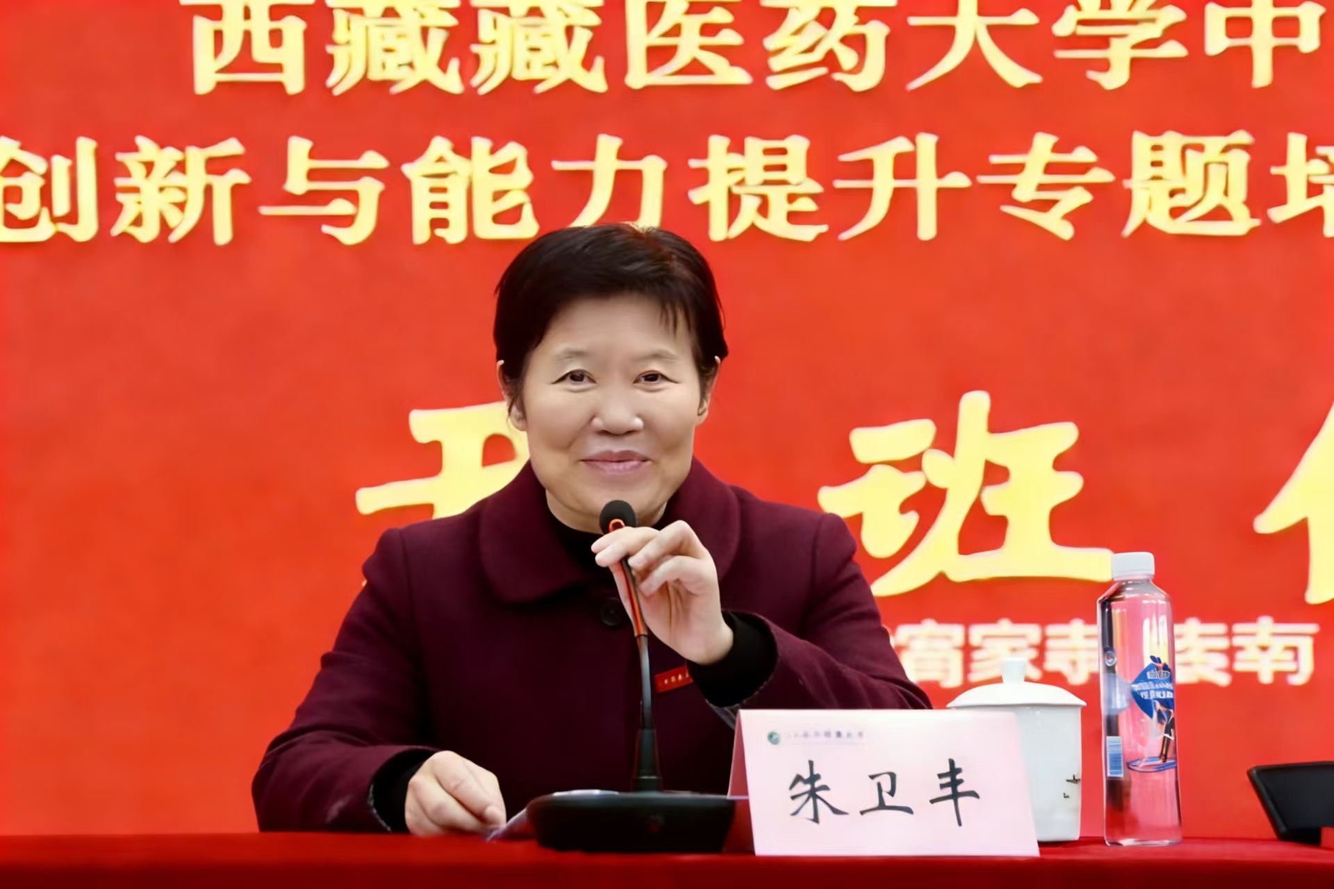 朱卫丰代表学校向西藏藏医药大学一行致以热烈欢迎。她回顾西藏自治区成立60周年的重要历史意义,以及两校21年来在对口支援、交融互鉴工作中结下的深厚情谊。她介绍了学校在人才培育、学科建设等领域的显著成就,并强调,对口支援是我校的责任与使命。她表示,我校将以优质的师资力量与周到的服务保障,确保本次培训顺利开展。她期望,双方能以此次培训为契机,进一步深化在学术共研、管理互鉴、文化交融等多方面的合作,携手书写赣藏同心的新篇章,为西藏高等教育与民族医药振兴、中医药事业整体发展及人类卫生健康共同体建设贡献更大力量。