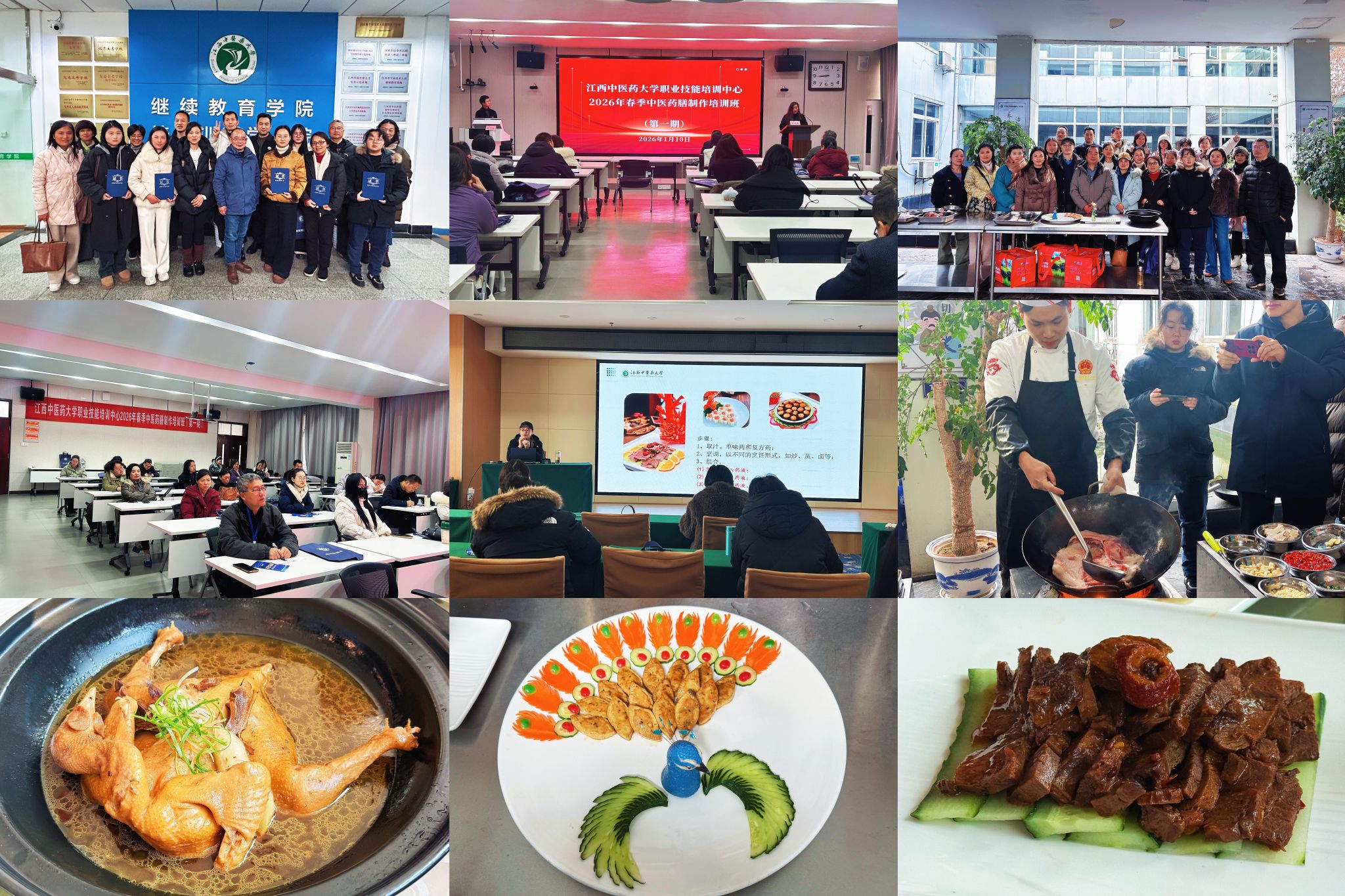 1月10—25日,江西中医药大学职业技能培训中心举办2026年第一期中医药膳制作培训班。培训部负责人尹文琦出席开班仪式并讲话,培训部行政助理封志锐主持仪式,培训部项目组成员及来自健康养生、医疗卫生、餐饮服务等领域的20名学员参加。